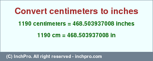 | 1190 (cm) | = 468.535433071 (in) | 1190 centimeters = 468.535433071 inches |