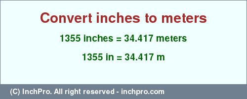 | 1355 (in) | = 34.419032 (m) | 1355 inches = 34.419032 meters |