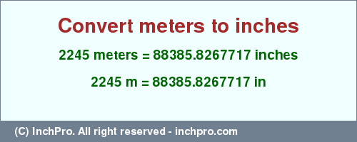 Currently, the field for meters contains the number 2245 (m) you can change it. Just enter any number into field for meters (for example any value from our set: 2246.0, 2247.0, 2248.0, 2249.0 meters or any other value) and get the fast result into field for inches. How to use the meter online calculator you can more detail read at this link manual for the calculator.
