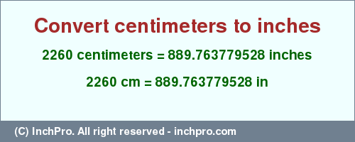 On this page we consider in detail all variants for convert 2260 centimeters to inches and all opportunities how to convert centimeters with usage comprehensive examples, related charts and conversion tables for centimeters. Here you will find all the ways for calculating and converting centimeters in inches and back. If you want to know how many inches are in 2260 centimeters you can obtain the answer in several ways: