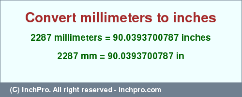 Currently, the field for millimeters contains the number 2287 (mm) you can change it. Just enter any number into field for millimeters (for example any value from our set: 2288.0, 2289.0, 2290.0, 2291.0 millimeters or any other value) and get the fast result into field for inches. How to use the millimeter online calculator you can more detail read at this link manual for the calculator.
