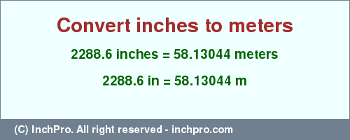 Currently, the field for inches contains the number 2288.6 (in) you can change it. Just enter any number into field for inches (for example any value from our set: 2289.6, 2290.6, 2291.6, 2292.6 inches or any other value) and get the fast result into field for meters. How to use the inch online calculator you can more detail read at this link manual for the calculator.