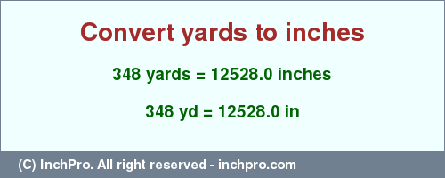 Results conversion 348 yards into inches. 348 yards to "in" is equal to 12528.0 inches.