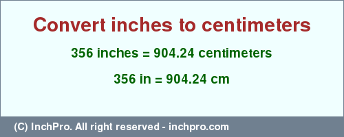 Results conversion 356 inches into centimeters. 356 inches to "cm" is equal to 904.24 centimeters.