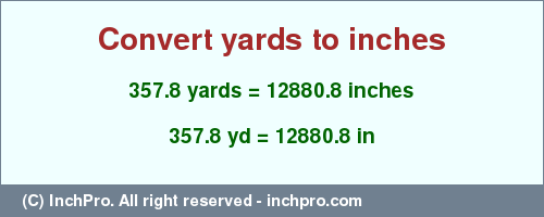 | 357.8 (yd) | = 12883.68 (in) | 357.8 yards = 12883.68 inches |