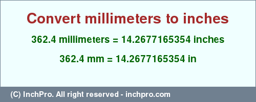 | 362.4 (mm) | = 14.2708661417 (in) | 362.4 millimeters = 14.2708661417 inches |