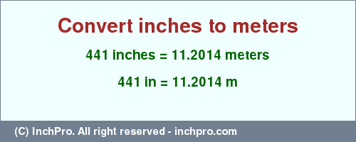 Currently, the field for inches contains the number 441 (in) you can change it. Just enter any number into field for inches (for example any value from our set: 442.0, 443.0, 444.0, 445.0 inches or any other value) and get the fast result into field for meters. How to use the inch online calculator you can more detail read at this link manual for the calculator.