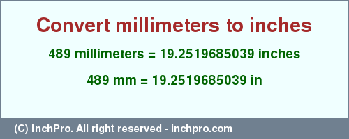 | 489 (mm) | = 19.2551181102 (in) | 489 millimeters = 19.2551181102 inches |