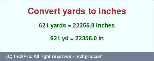 | 621 (yd) | = 22358.88 (in) | 621 yards = 22358.88 inches |