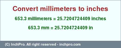 | 653.3 (mm) | = 25.7236220472 (in) | 653.3 millimeters = 25.7236220472 inches |