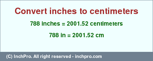 Results conversion 788 inches into centimeters. 788 inches to "cm" is equal to 2001.52 centimeters.
