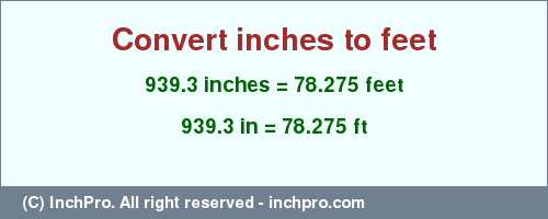 Results conversion 939.3 inches into feet. 939.3 inches to "ft" is equal to 78.275 feet.